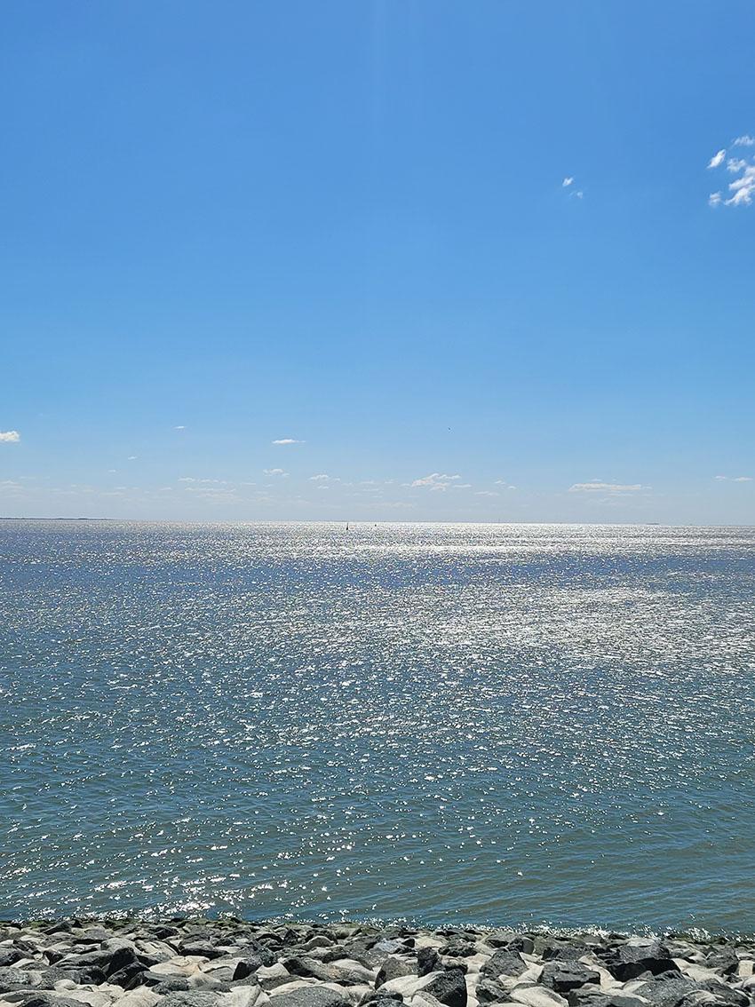 Unsere Tour endete nach fast 5 km mit dem Rolli wieder auf dem Deich; im Gegenlicht glitzerten die Wellen des auflaufenden Wassers, die Segel der auslaufenden Yachten zogen wie an einer Perlenschnur gezogen Richtung See. So viele Erinnerungen kamen hoch, eine Mischung aus Glückseligkeit, Wehmut, Freunde und innerlichem Frieden.
